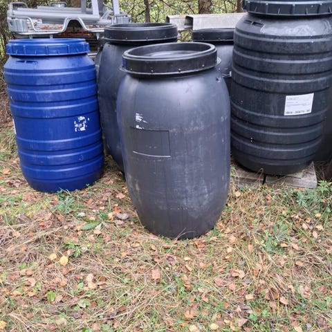 Useampi siisti korkillinen muovitynnyri uusiokäyttöön.