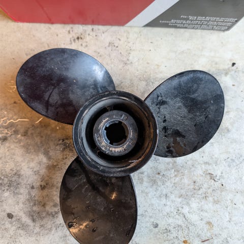Uusi Mercury Spitfire 14 x 23" RH4 nelilapainen alumiinipotkuri (48-8M0084497) laatikossaan. Irtokeskiömalli ja paketissa mukana Mercuryn keskiö Flo-Torq II 835257K (15-urainen)