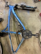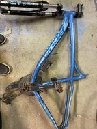 Pyörän takahaarukka on vääntynyt, kuten kuvasta näkee. Lisäksi puuttuu satula, ohjaustanko ja oikeastaan molemmat renkaat vanteineen. Kyseessä ei ole varastettua tavaraa, vaan eräältä metallilavalta pelastettua tavaraa. Tästä alumiinirungosta joku saisi vielä veisteltyä itselleen mainion kulkuvälineen pienellä nikkaroinnilla. Pyörän ovh. kaikkine osineen uutena on noin 500€