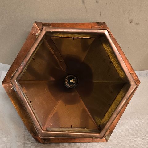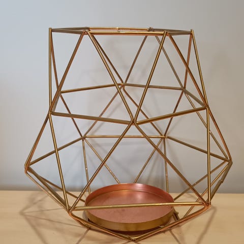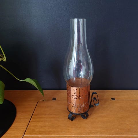 Kaunis kuparilyhty missä sisällä lasipullo minne on laitettu LED-valot.