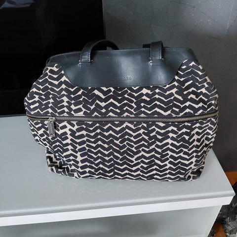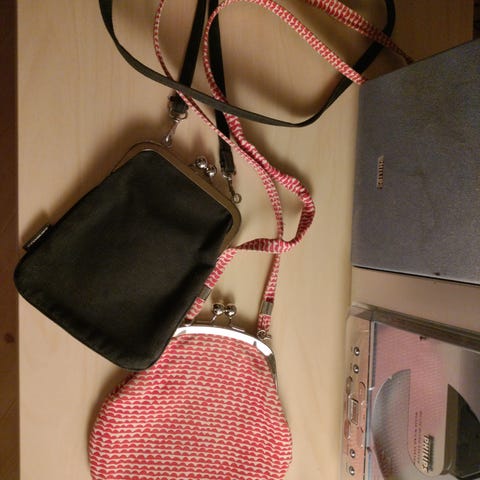 Itse lyhennetyllä hihnalla oleva pieni laukku. Koko korkeus 17.5 cm x 14.5 cm leveimmästä kohtaa leveys