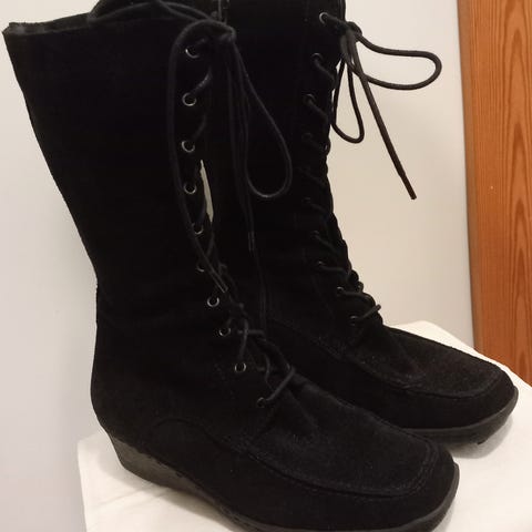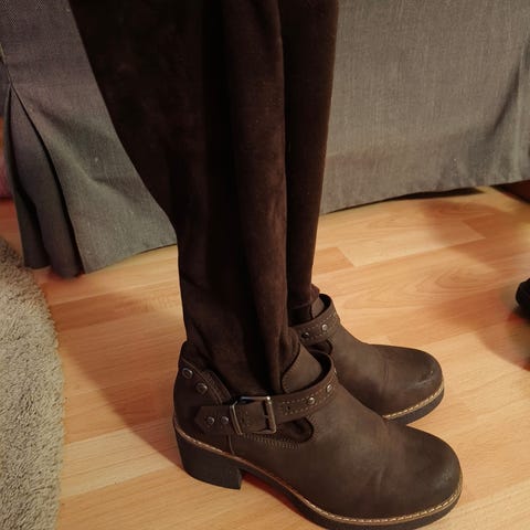 Pitkävartiset mokkanahkasaappaat. Väri mielestäni pehmeä roosa. Koko 39. Lestiltään aika kapea malli. Siistikuntoiset, ehjät, vetskarit toimivat moitteettomasti, korkolaput ok, pohjan kärjissä metallivahvikkeet. Kevyitä jälkiä on paikka paikoin, kun läheltä katsoo.
