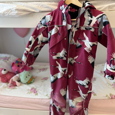 Molon viininpunainen/burgundy talvihaalari. Kuva hieman vääristää sävyä. Polvissa päälikankaassa kulumaa, alla oleva kalvo vaikuttaa ehjältä. Pepussa melko pientä pehmentymää. Muutoin kangas hyväkuntoinen. Vetoketjun alaosaan ommeltu "stoppariksi" lankaa.