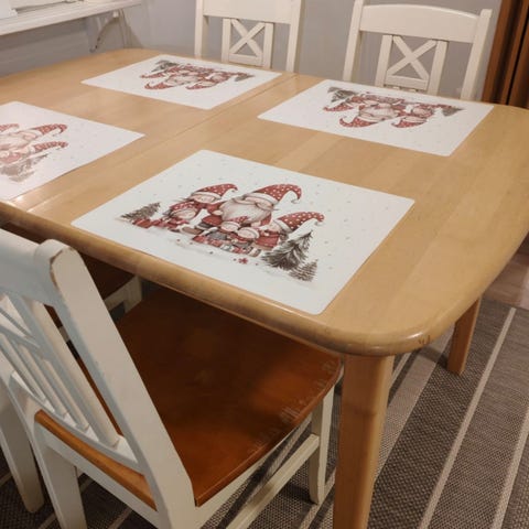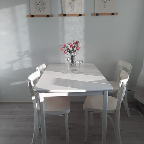 Neljän hengen ruokailuryhmä, käytönjälkiä löytyy, mutta edelleen tukeva ja yleisilmeeltään siisti. Pöytä ja neljä tuolia. Saa tarjota!