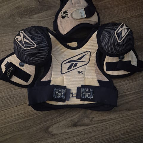 Reebok jääkiekon hartiasuoja, värit valkoinen ja sininen. Suunniteltu jääkiekon harrastajille tarjoamaan suojaa ja liikkuvuutta pelin aikana. Materiaali ja koko eivät ole tarkasti määritelty, mutta panssari sisältää pehmustettuja osia ja säädettäviä kiinnityksiä.