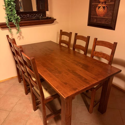Koivu ruoka pöytä jota pystyy jatkamaan keskeltä 36cm. Ruoka ryhmään kuuluu 4 tuolia. Osaa tuoleista käytetty enemmän ja osa siistimmässä kunnossa.