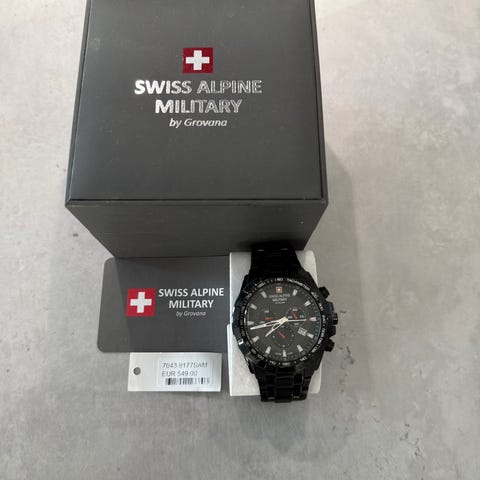 Swiss Military Hanowa miesten rannekello, jossa musta kellotaulu ja nahkaranneke. Kellossa on safiirilasi ja ruostumattomasta teräksestä valmistettu kotelo. Kello on vesitiivis 10 ATM asti/100m, ja siinä on kronografitoiminto=ajanotto, sekä kompassimerkinnät kellotaulussa.
