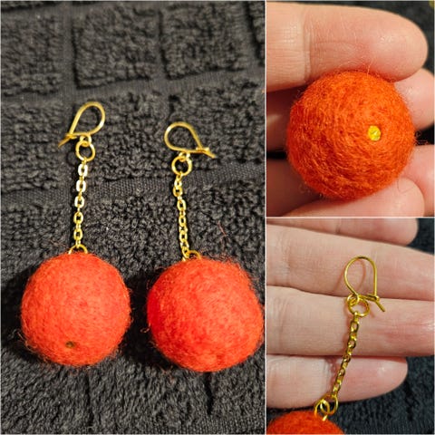 Punaiset ja siniset huopapallo korvakorut. Punaisia joskus käytetty, siniset käyttämättömät. Pituudet n. 5cm, koukut korumetallia.