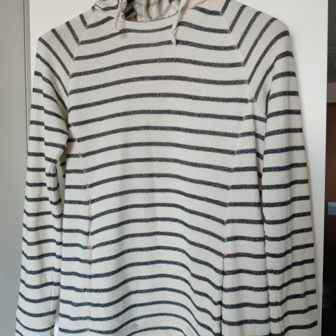 Rento ja persoonallinen pitkä huppari trikookankaasta.