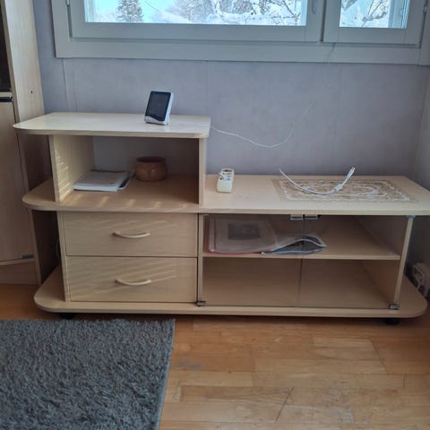 Valkea tv-taso kahdella kaapilla ja kahdella hyllyllä.