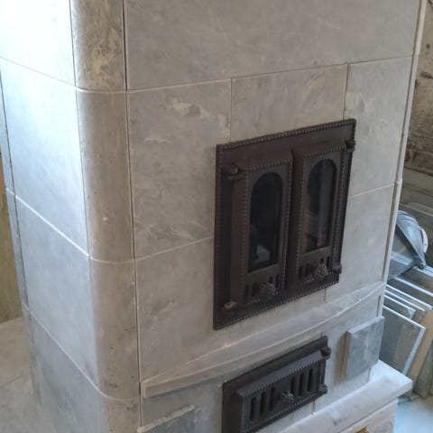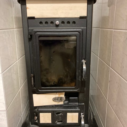 "Faure" Finland 1" takka, emaloitu valurautaa. Ranska, 1960-1980. Täysin kunnostettu. Paino: noin 50 kg. Koko 60 x 40 x 40 cm.