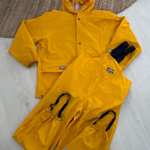 Hyväkuntoiset Rukka sadehousut kokoa 134cm. Housuissa hieman tummentumaa joka saattaa lähtee pesussa tai ainakin vahvemmalla pesuaineella jos se häiritsee. Itseä se ei kurakelissä käytettävissä housuissa ole häirinnyt.