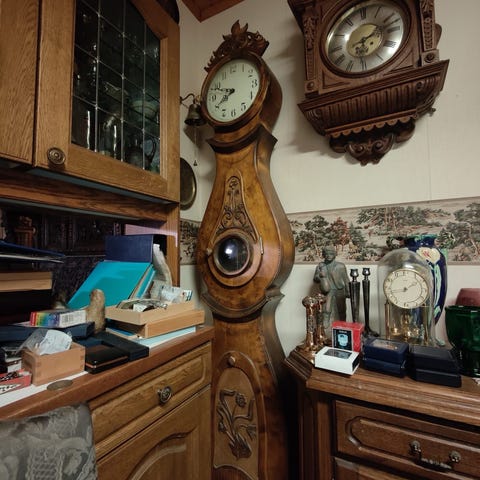 Kaappikello sähkökoneistolla eli heiluri on koristeena.Alkuperäinen koneisto tallella.Vaatii korjausta.Mitat k.217cm. l.46cm. s25cm.
