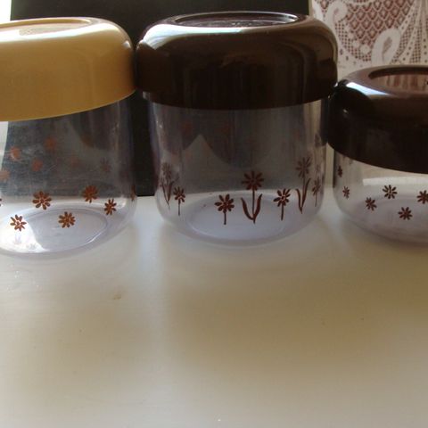 Jotain käytön jälkiä toki löytyy näin vanhasta, mutta ehjiä ovat ja kannet tosi tiiviitä, yksittäin 4€, kaikki yhteensä 10€