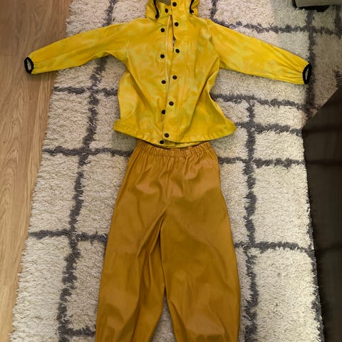 Makian talvitakki ja Nordbjörnin sadetakki + kurahousut. Pienet nirhaumat molemmissa takeissa, hyvät edelleen käyttöön, voi halutessaan vaikka vaatetarralla paikata. Meillä oli käytössä 104-116 kokoisella.