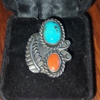 Antiikkinen aito Navajo intiaani hopea sormus turkoosilla ja koralilla.