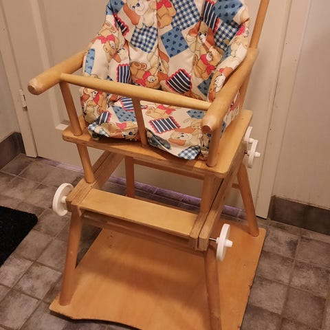 Myydään tukeva syöttötuoli uudella pehmusteella. Saa käännettyä pöytä ja tuoli yhdistelmäksi. Nouto Nekalasta.