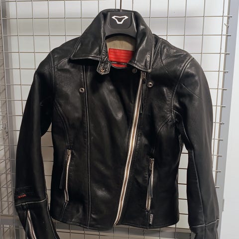 Tosi siisti naisten ajotakki! Aitoa lehmännahkaa. Suojat olka-ja kyynärpäissä ja selässä tasku selkäsuojalle. Kuvista ei välity takin todellinen väri kovin hyvin, on luonnossa vihertävänharmaa, eli tuo vihreän sävy jää kuvissa vähän piiloon. 100% ehjä!
