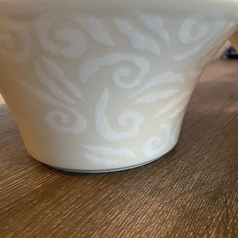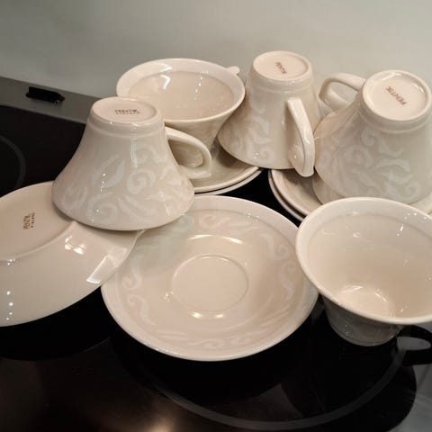 Myynnissä 8 kpl Pentikin vanilja teemaisia kahvikuppeja ja lautasia sekä 1 kermakko