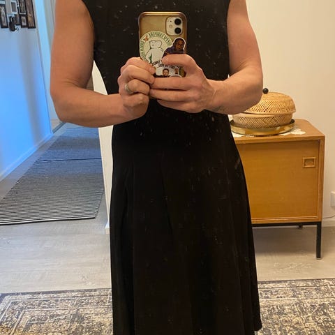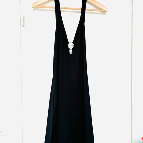 Musta espritin mekko. Uudenveroinen, kerran käytetty. Keinonahkaa edessä ja takana, kauttaaltaan joustavaa materiaalia. Vuoritettu, ei hiosta. Vetoketju selässä. Koko 36, menee S-M. Mekko tasainen musta, peili näemmä todella likainen. Henkarikuvassa todellinen, tasainen musta väri.