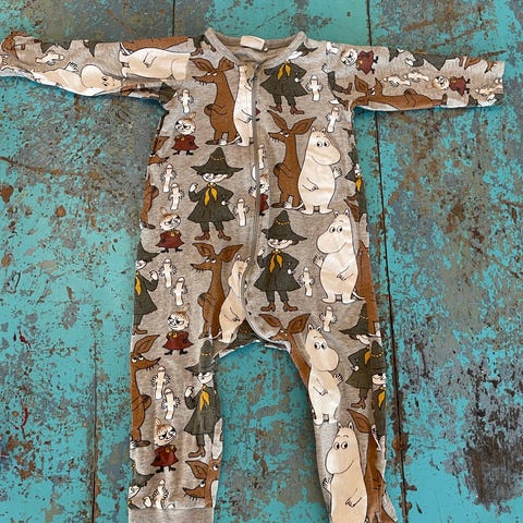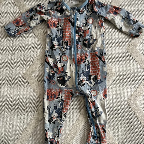 Moomin vauvan pyjama, koko 80. Pesussa vähän haalistunut, muuten kunto hyvä. Nouto Suutarilasta.