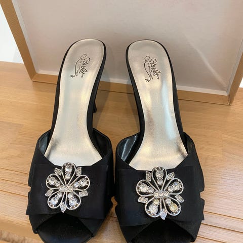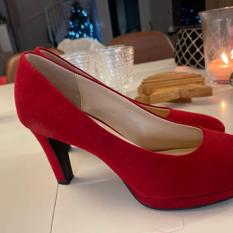 Friis & co:n juhlakorkkarit. Open toe dramaattisia punaisia varpaankynsiä varten! Söpöt velourirusetit koristeena. Pinta himmeästi kimaltavaa kuosia.