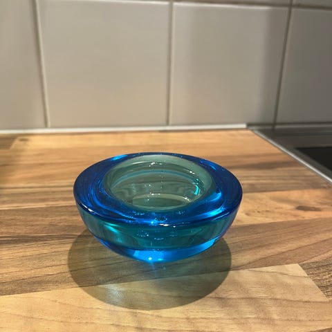 Iittala koriste-esine, valmistettu lasista, sininen väri. Pieni koko, halkaisija noin 6,5 cm. Soveltuu sisustukseen tai keräilyesineeksi.