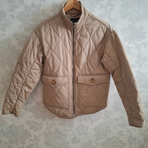 Vilan beige tikkitakki, koko XS. Takissa on tikattu kuosi ja siinä on napit ja vetoketju edessä. Nouto Lahdesta tai Toridiili 5€