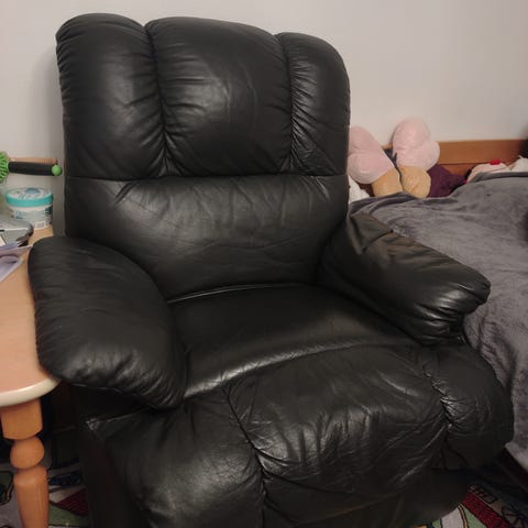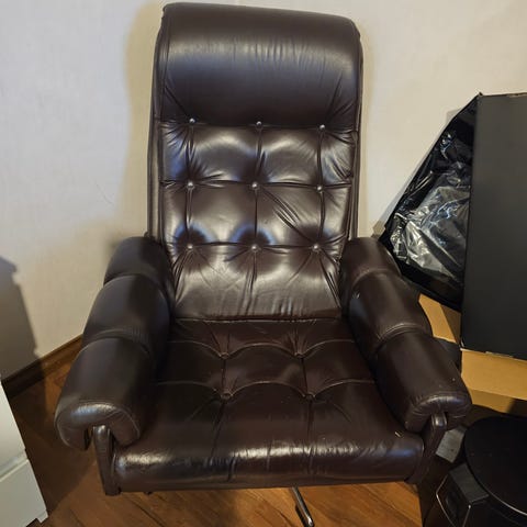 Hyvässä kunnossa oleva nahkainen nojatuoli.