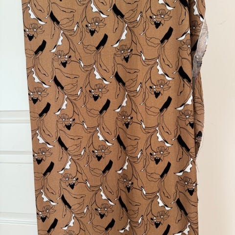 Luonnonvalkoinen kivipesty pellava, pesty kerran hajusteettomalla pesuaineella. Kolmessa osassa: 2,8m, 2,8m ja 2,4m. Pienimmästä palasta on otettu pieni pala kulmasta. Arvo 120€.