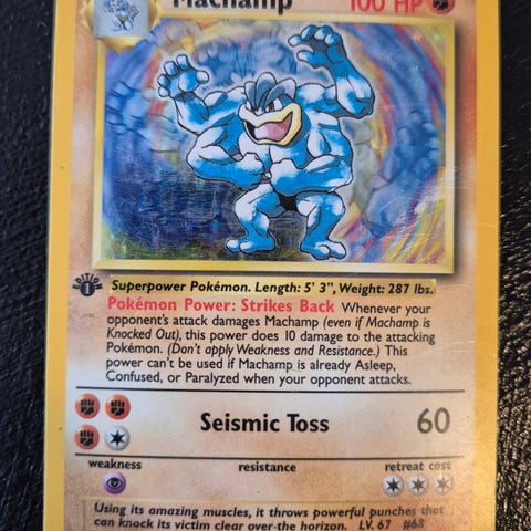 Pokémon macamp -keräilykortti, jossa on kortin kuva ja takapuoli. Kortti sisältää tietoja hyökkäyksestä ja sen vaikutuksista pelissä. First Edition.