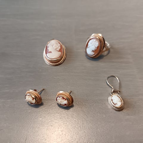 Vanhoja camee koruja, kameekoruja. Leimat löytyy kuvista. Sormus, riipus/rintaneula ja toiset korvikset k 14 kultaa. Erikoisen kiinnityksen omaavat korvikset luultavasti kullattua 800 hopeaa.