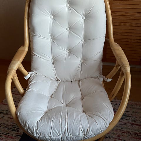 Kuvan löhötuoli. Haalistut ja jalkojen punokset osin auenneet. Tukeva