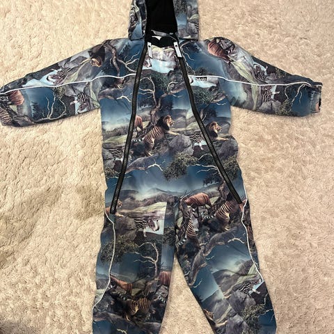 Ehjä ja lämmin talvihaalari. Irrotettava huppu, hupun turkisreuna ei tallessa. Ei eläintalous.
