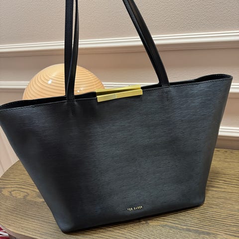 Ted Baker nahkainen laukku mustassa värissä. Laukussa on kaksi pitkää kantohihnaa ja irrotettava sisälaukku, joka toimii myös erillisenä pikkulaukkuna. Mukana säilytyspussi. Kunto hyvä, pieniä käytön jälkiä kantohihnassa (katso kuva).