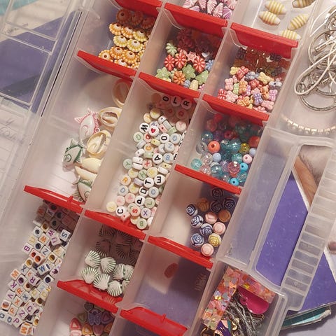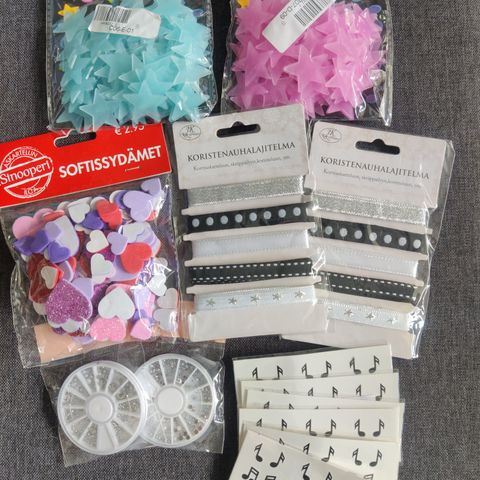 Paljon erilaista askartelu tarviketta muun muuassa erilaisia helmiä, kirjaimia, posliini? päitä ja käsiä, lahjakasseja yms