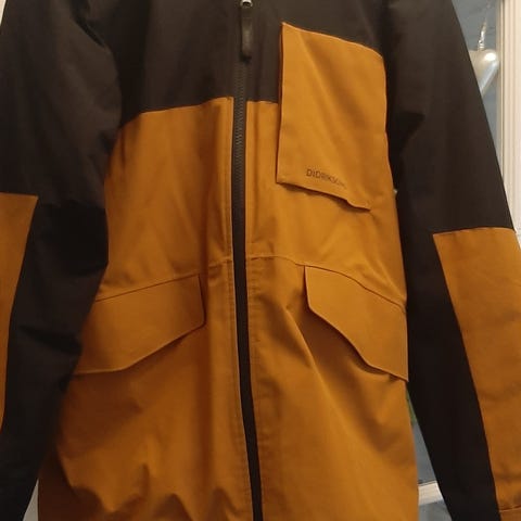 Sininen Didrikssonin takki, koko S. Vähän mustaa hihassa, minkä huomasin kuvatessa. En ole yrittänyt poistaa. Huomioitu hinnassa.