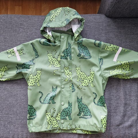 Sadetakki kokoa 104. Peuhu-merkkinen, hyvässä kunnossa vielä. Edessä kahden alimman nepparin välissä tahra joka ei lähtenyt pesussa ja takana helman alaosassa tummentumaa jota en saanut kuvaan kovin hyvin, kts. yst. kuvat.