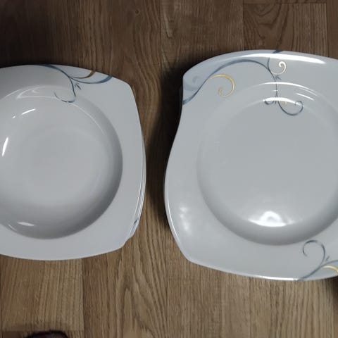 Hyväkuntoisia Victoria apilanlehti astioita. 6kpl pienempiä lautasia 22x22cm, 6kpl isompia lautasia 27x27cm ja 3-kerroksinen tarjoilualusta.