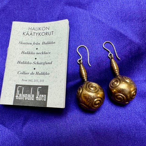 Kalevala Koru Halikon kääty sormus ja korvakorut filigraani pallolla. Korvakorut eivät vaadi reikiä, sillä niissä on klipsi kiinnitys. Sormuksen koko n. 16 mm.