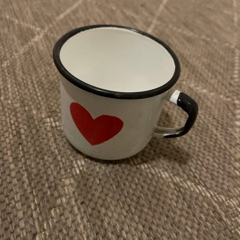 Arabia Emalimuki 0,3 litraa, valmistettu emalista. Valkoinen muki, jossa suuri punainen sydänkuvio. Sopii kuumien ja kylmien juomien tarjoiluun. Valmistettu Suomessa. Kuluneisuutta mutta yleisilmeeltään siisti, pyydä tarvittaessa lisäkuvia kuvien mukaisessa kunnossa..