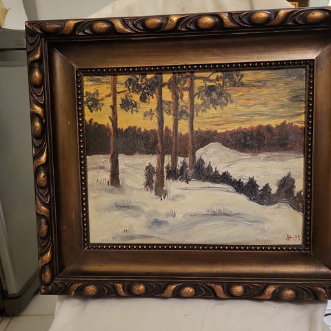M. Jansonin öljyvärityö "Talvinen iltarusko". Kehyksen korkeus on 41 cm ja leveys 48 cm.
