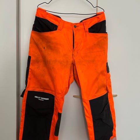 Helly Hansen C44 työhousut, koko 46, oranssin ja mustan väriset. Valmistettu kestävistä materiaaleista, suunniteltu työympäristöihin. Sisältää useita taskuja ja heijastavia yksityiskohtia näkyvyyden parantamiseksi. Riipputaskut. Ehjät housut, tummentumaa hieman. Yhdellä nuorella olleet käytössä