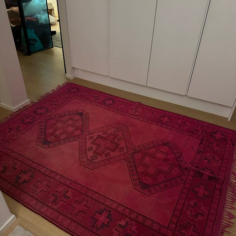 Upea käsintehty aito villamatto, koko 80x68. Matto on erittäin paksu ja jämäkkä. Säilytetty rullalla, joten kuvassa reunat taittuvat. Suoristuu kun antaa maton asettua.