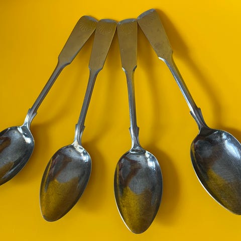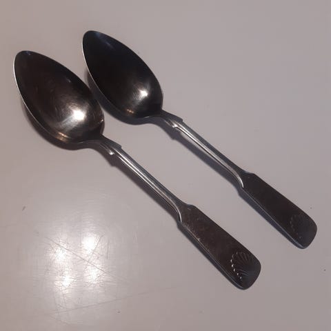 Uushopeaiset kauniit pikkulusikat 1933 vuodelta (varressa kaiverrus takapuolella) UH merkintä. Etupuolella kaiverrus Helli. Säilytyslaatikko mukana