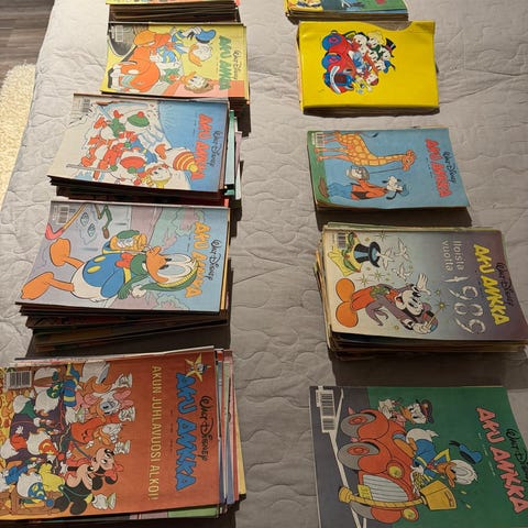 Valtava kokoelma Aku Ankkoja eri vuosilta. Kuvissa nähtävissä määriä eri vuosilta. Näiden lisäksi vielä muitakin lehtiä lisätty. Lehdet vaihtelevassa kunnossa mutta kaikki luettavia, valtaosa oikein hyvässä kunnossa. Tästä tuhti lukupaketti ankkafanille. Ensisijaisesti nouto, koska painavan paketin postittaminen maksaa.
