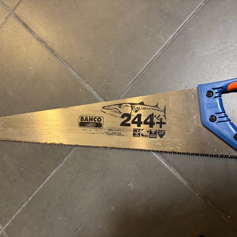 Swordfish brand käsisaha, jossa on metallirunko ja punainen muovinen kahva. Soveltuu erilaisten materiaalien sahaamiseen käsikäyttöisesti. Työkalu on suunniteltu kestävyyttä ja tarkkuutta varten.