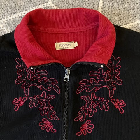Vastaa parhaiten 44-46 kokoa. Taskut ja edessä napitus.