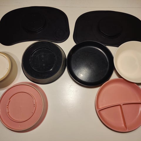 Mukana Twistshaken silikonialusta, lautanen ja kansi. Myös Minikoioi:n silikonilautanen ja 4 lusikkaa (2 Mylo ja 2 Mamin).