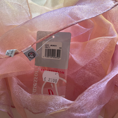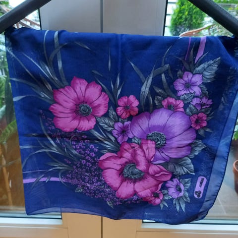 Läpikuultava violetti huivi leveys 59 cm pituus 180 cm. Kangas organza tyyppinen, "rypyllinen."